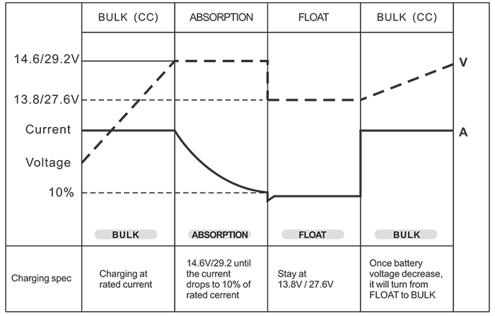 Kontrola akumulatora (3-stopniowe ładowarki akumulatorów) Masowe / Absorpcyjne / Pływające